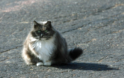 Momma Kitty emerges from her haystack home to bask in the sun and warmth.